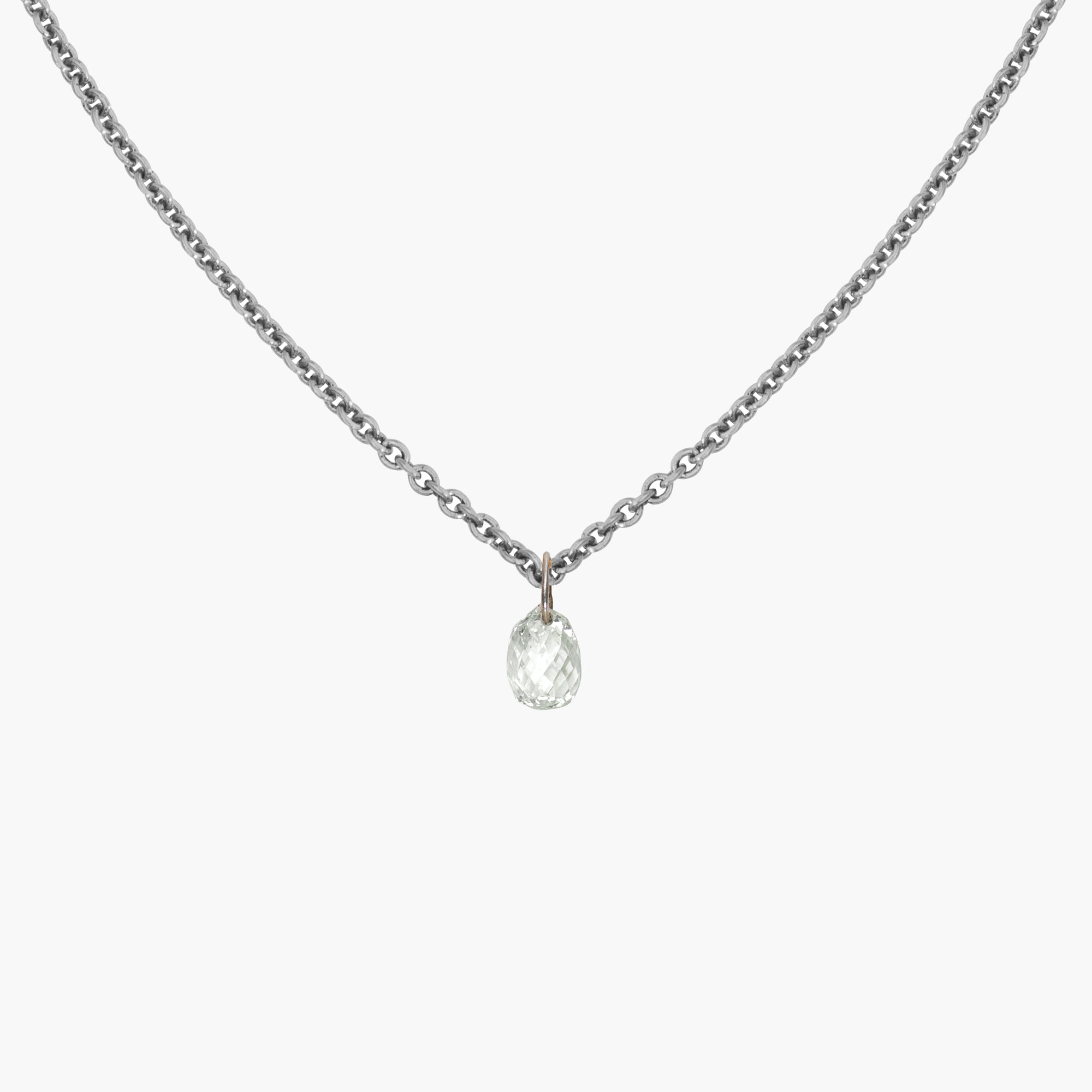 Unsere Halskette verzaubert durch eine romantische Anmutung. Der Anhänger ist ein Solitär Diamant als Briolette geschliffen und lädt mit dieser besonderen Anmutung zum Träumen ein.