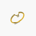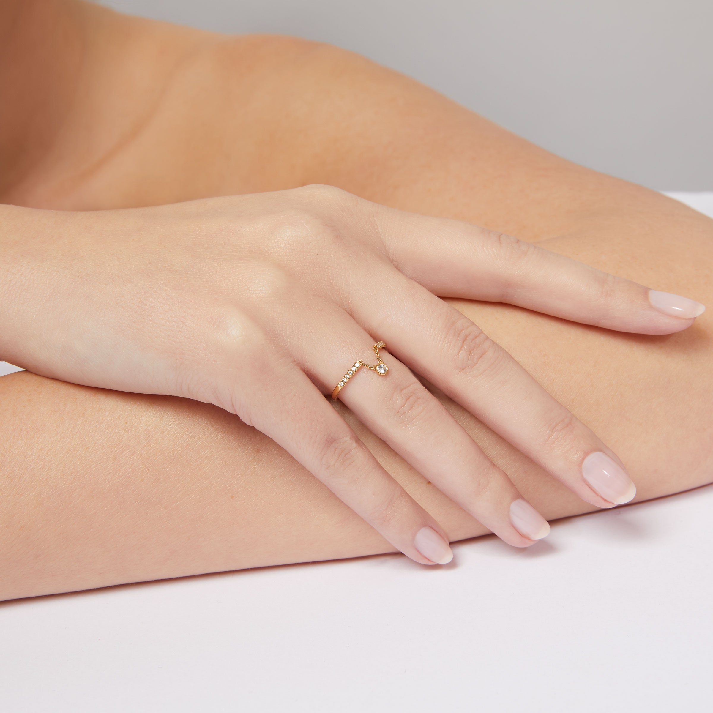 Wie es der Name vielleicht erraten lässt, hat unser Ring Move einen beweglichen Diamanten. Dieser ist mittig mit kleinen Gliederketten in den Ring eingesetzt und schwingt spielerisch bei der Handbewegung mit.