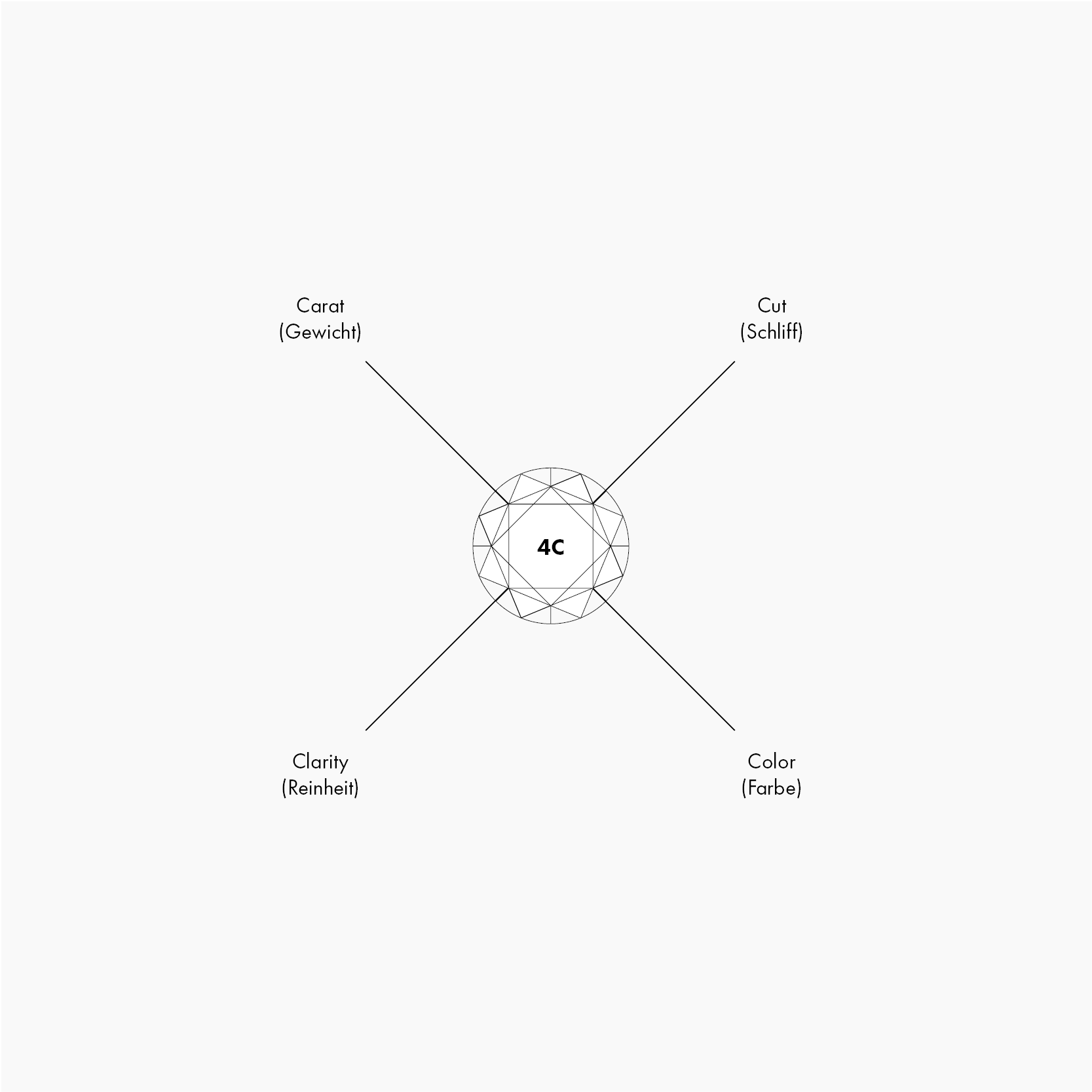 Neben der Größe und der Fassung des Steines kommt es im Wesentlichen auf die vier C´s an. Diese stehen für Carat, Cut, Colour and Clarity – also für Karat, Schliff, Farbe und Reinheit. Der Wert eines Diamanten wird immer unter Berücksichtigung aller vier Faktoren bestimmt – es kommt also auf ein ausgeglichenes Zusammenspiel an. Wir erklären Ihnen im Folgenden jedes einzelne C ausführlicher, sodass Sie selbst zum Diamanten-Kenner werden.