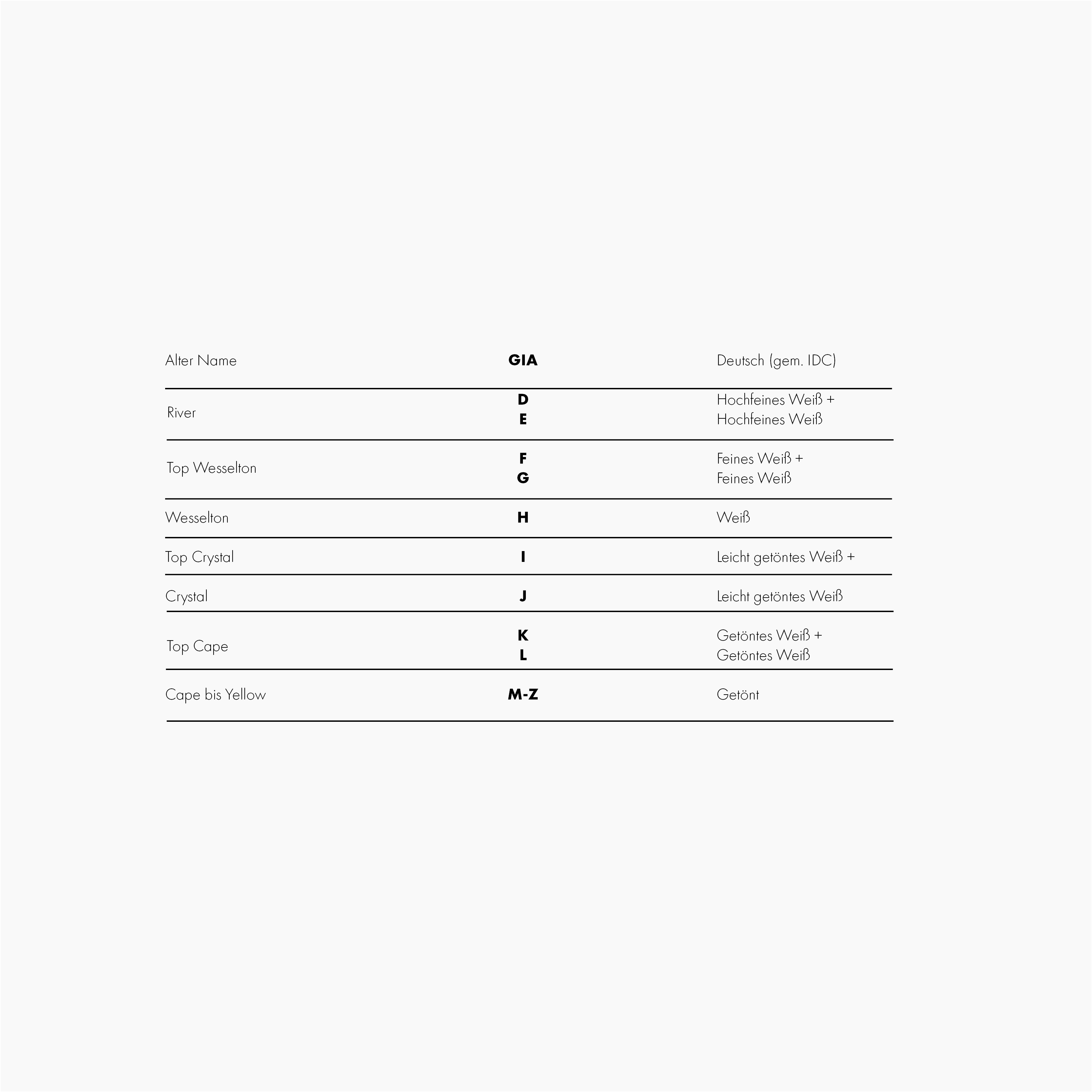 Die Farbe eines Diamanten wird anhand einer Farbskala bestimmt, welche bei D beginnt und bei Z aufhört. Diamanten im Bereich D bis F gelten als farblos, jene ab I nehmen in der Tönung zu.