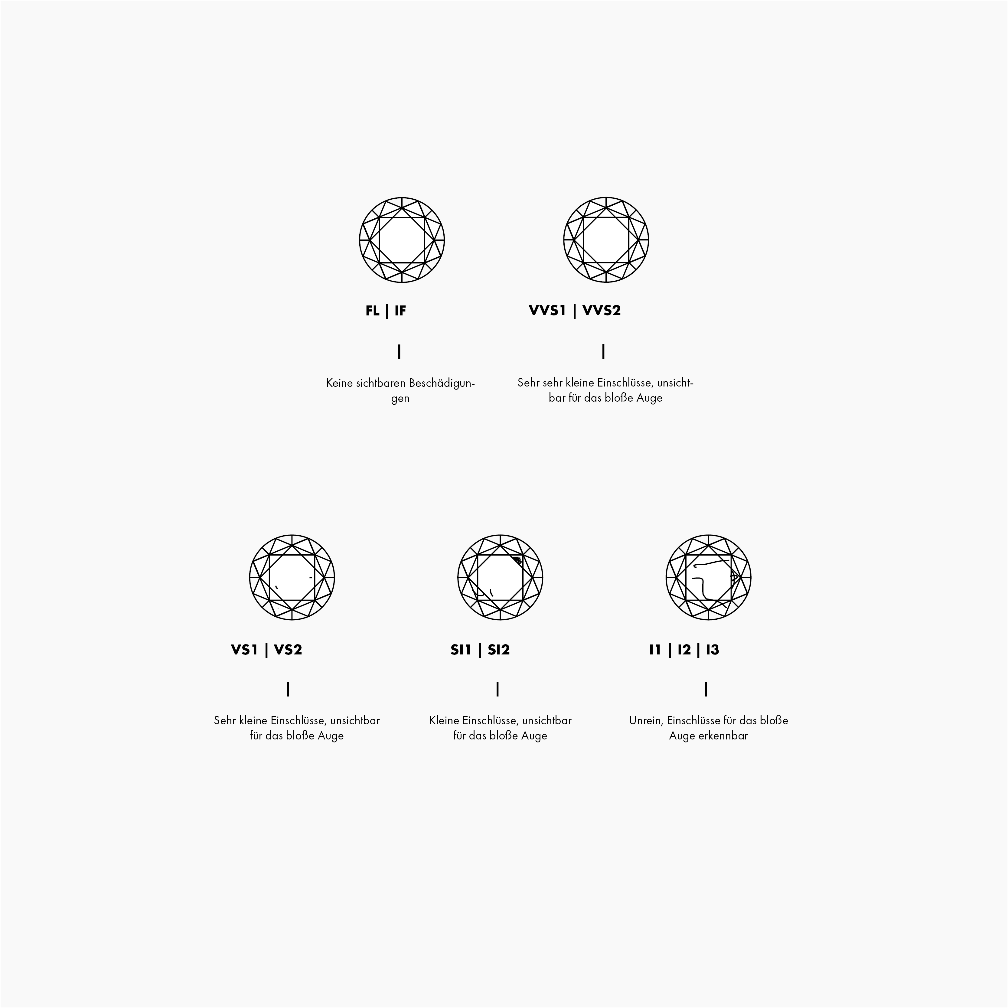 Unter 10-facher Vergrößerung werden die Diamanten hinsichtlich Einschlüssen und Beschädigungen auf der Oberfläche überprüft. Diese teils mikroskopisch kleinen Einschlüsse werden, wie die Farbe, mittels einer Skala klassifiziert. Auch hier gilt wieder, je reiner der Diamant, desto wertvoller. Diamanten, ohne Einschlüsse oder erkennbare Defekte werden als Lupenrein bezeichnet und werden als FL oder IF klassifiziert. Diamanten, bei denen die Einschlüsse mit dem bloßen Auge erkennbar sind gehören zu den Klassen I1,I2 oder I3.